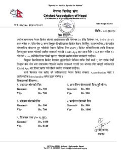 त्यस्तै, फाइनल खेलका लागि भने सामान्यतर्फ पाँच सय र भीआईपीतर्फ एक हजार रुपैयाँ मूल्य तोकिएको क्यानले जनाएको छ । टिकट खल्ती वालेटबाट काट्न सकिने क्यानले जनाएको छ । सिजनल पासको हकमा २० प्रतिशत छुटसहित सामान्यतर्फ चार हजार चार सय ८० र भीआईपीतर्फ आठ हजार दुई सय ४० रुपैयाँ मूल्य निर्धारण गरिएको क्यानको विज्ञप्तीमा उल्लेख छ ।