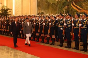 काठमाडौं- चीनको औपचारिक भ्रमणमा रहेका प्रधानमन्त्री केपी शर्मा ओलीलाई चिनियाँ समकक्षी ली छ्याङले ग्रेट हल अफ पिपलमा स्वागत गर्नुभएको छ ।