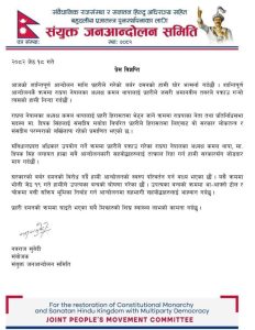 काठमाण्डौ/जेठ १९ गते- राप्रपा, राप्रपा नेपाल सहितको संयुक्त जन आन्दोलन समितिले राजा सहितको हिन्दु अधिराज्य माग राख्दै गदै आएको अनिश्चितकालीन जन आन्दोलनको क्रममा हिजो आईतवार पूर्व उपप्रधानमन्त्री तथा राप्रपा नेपालका अध्यक्ष कमल थापा राप्रपा सांसद दिपकवहादुर सिह सहितका ८ जना नेता कार्यकर्तालाई प्रहरीले प्रकाउ गरिएको भन्दै भन्दै संयुक्त जन आन्दोलन समितिका संयोजक नवराज सुवेदीले हिजो प्रेस विज्ञप्ति जारी गरेर आज जेठ १९ गते सोमवार उपत्यका बन्द आव्हान गरेका थिए। तर राष्ट्रीय प्रजातन्त्र पार्टीका केन्द्रीय अध्यक्ष राजेन्द्र लिङ्देलले आजको बन्दका विषयमा कुनैपनि छलफल नभएको बताउंदै राप्रपा बन्द कार्यक्रममा सहभागी नहुने जानकारी दिएका छन।