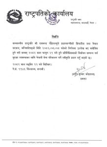 काठमाण्डौं/मङ्गसिर ११ गते-शुसिला कार्की मन्त्रिपरिषद्को निर्णय एंव सिफारिशमा आउॅंदो फागुन २१ गते आम निर्वाचनका लागि नेपाली सेना परिचालन गर्ने निर्णय गरिएको राष्ट्रपति कार्यालयले आज विज्ञप्ति मार्फत जानकारी दिएको छ।